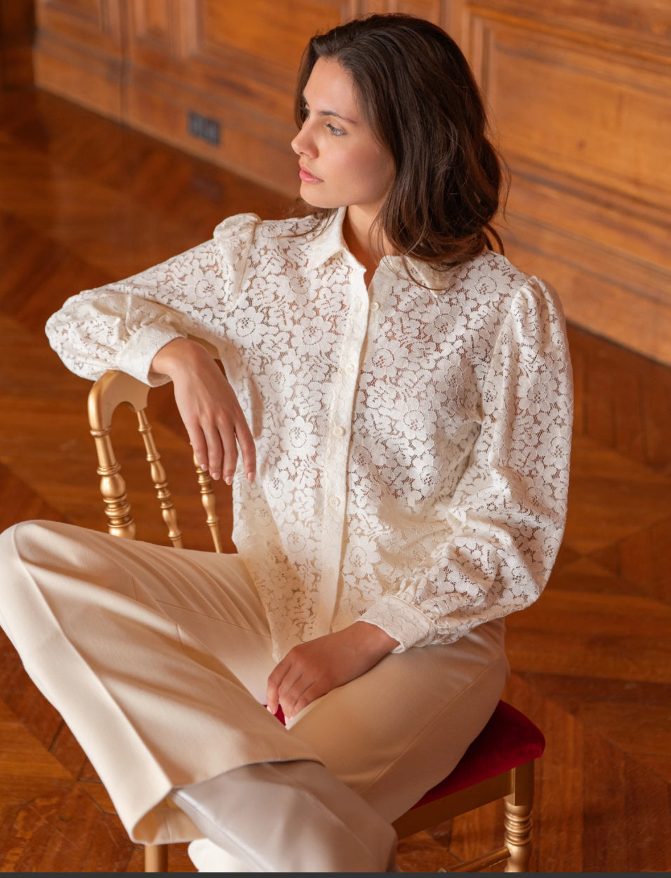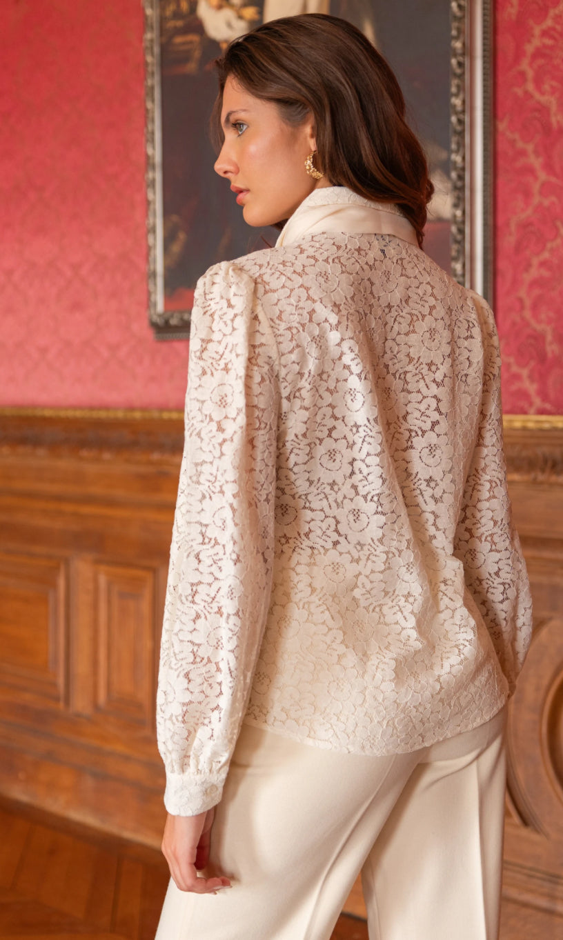 Herkkä pitsi ja irrotettava lavallière-rusetti tekevät tästä paidasta samaan aikaan rohkean ja runollisen. Se on todellinen katseenvangitsija, jossa vintage-henki yhdistyy moderniin hienostuneisuuteen. Yhdistä korkeavyötäröisiin housuihin itsevarman tyylin luomiseksi tai takin alle, kun haluat klassisen ja viimeistellyn ilmeen. Irrotettavan rusetin ansiosta voit muokata tyyliäsi tilanteen mukaan – elegantin naisellisesta pelkistetyn tyylikkääseen.Suora ja laskeutuva malli.
