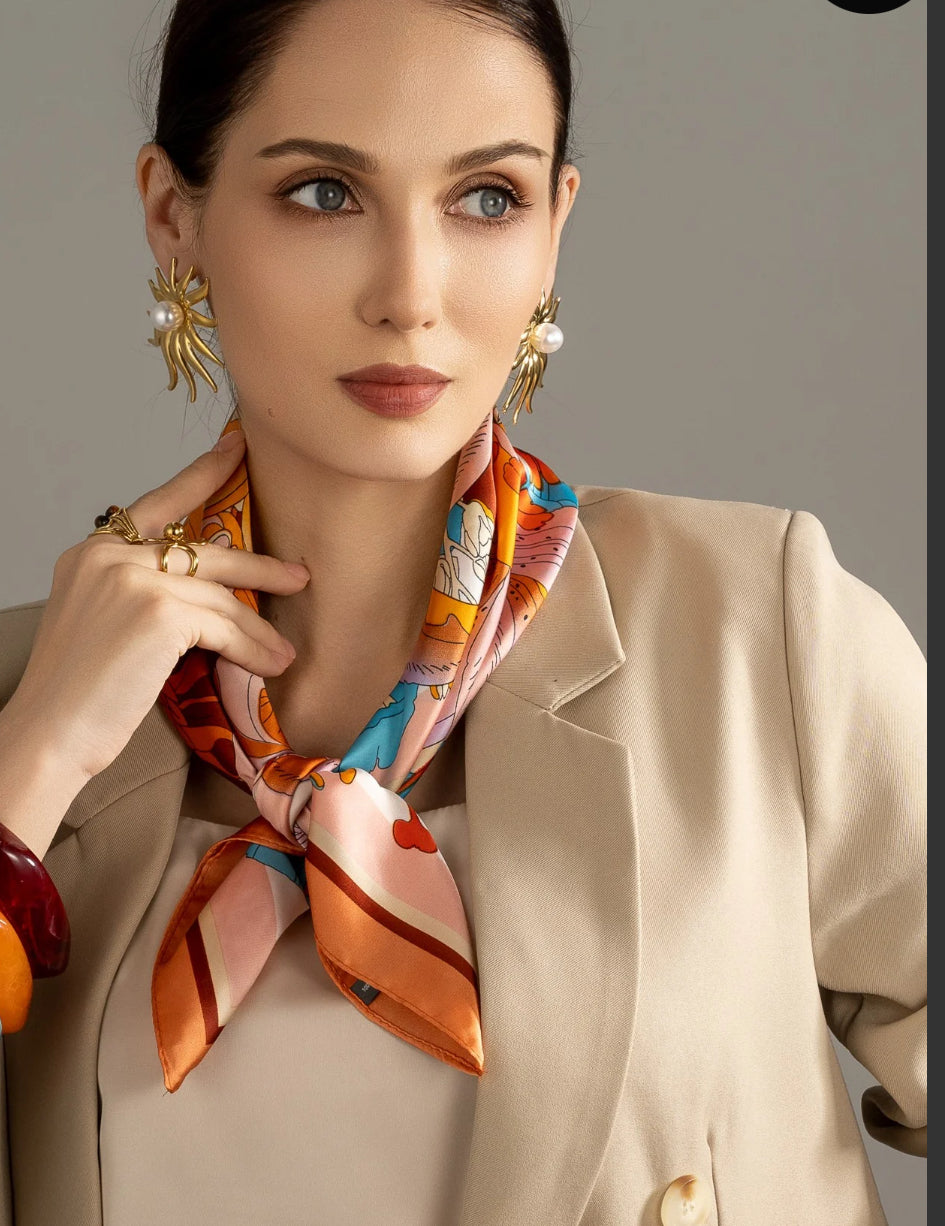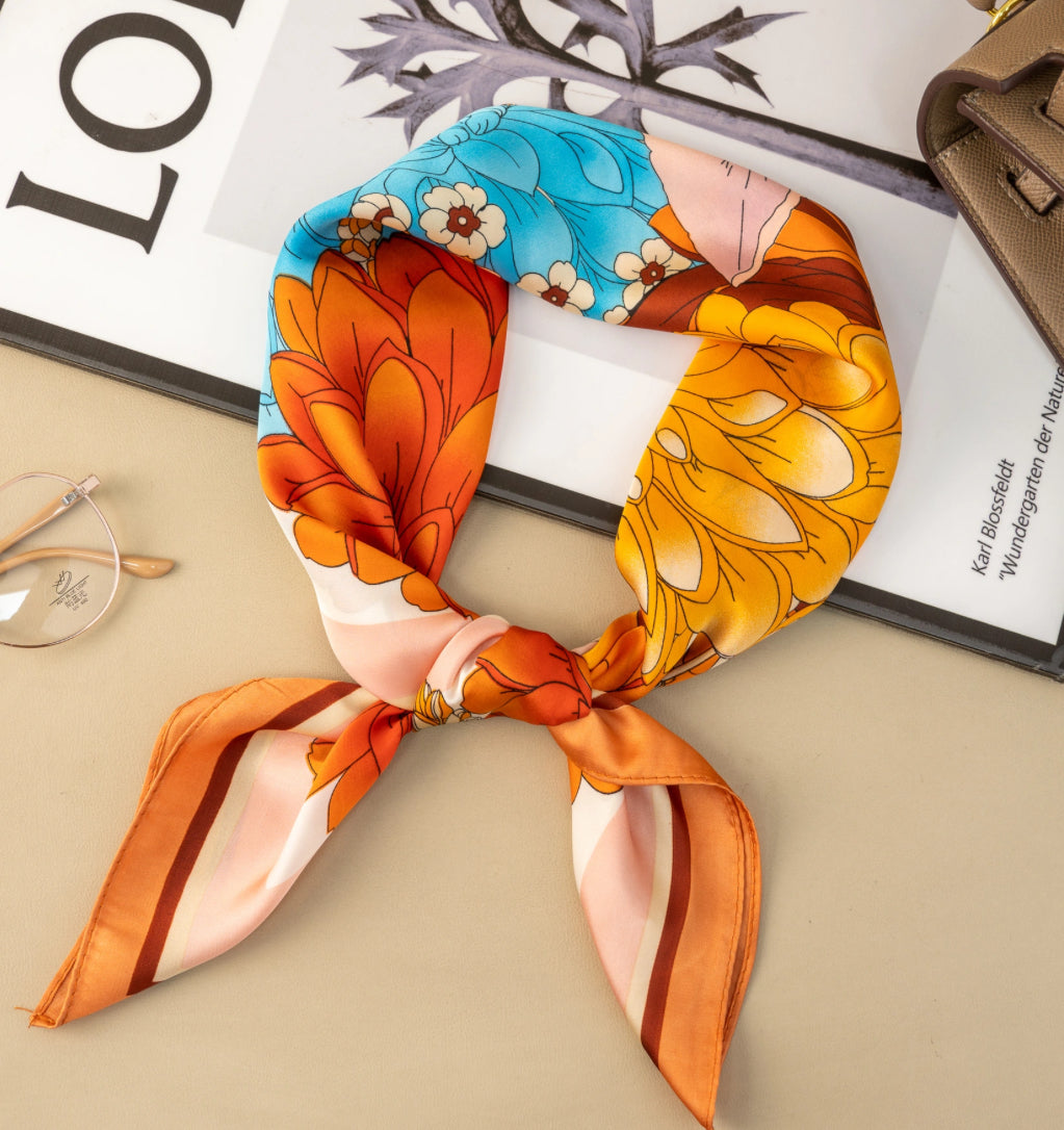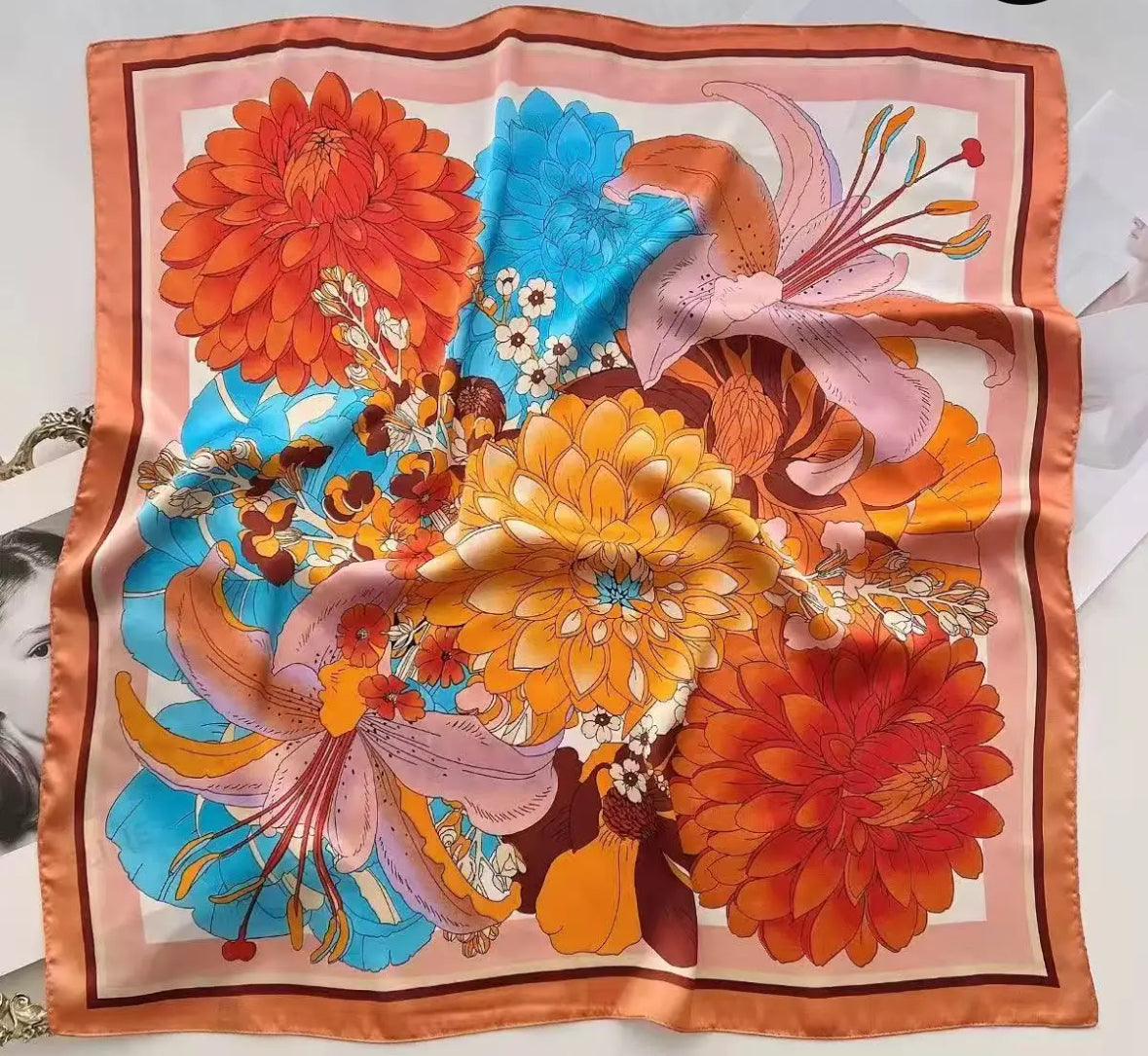 Tämä x kokoinen silkkimäinen huivi piristää tyyliäsi eloisilla kukkakuvioilla oranssin, sinisen ja pinkin sävyissä. Silkkimäinen pinta tarjoaa ylellisen pehmeyden ja kauniin laskeutuvuuden. Sopii käytettäväksi kaulalla, hiuksissa tai laukun koristeena, tuoden asuusi raikkaan ja naisellisen vivahteen.
