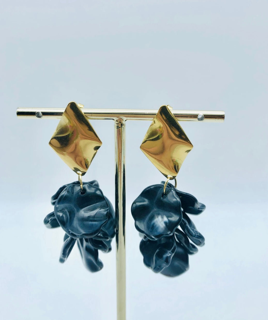 Näyttävät riippuvat korvakorut yhdistävät kauniin sinisen sävyisen hartsin. Malli sopii täydellisesti tuomaan väriä ja viimeistelemään tyylin.