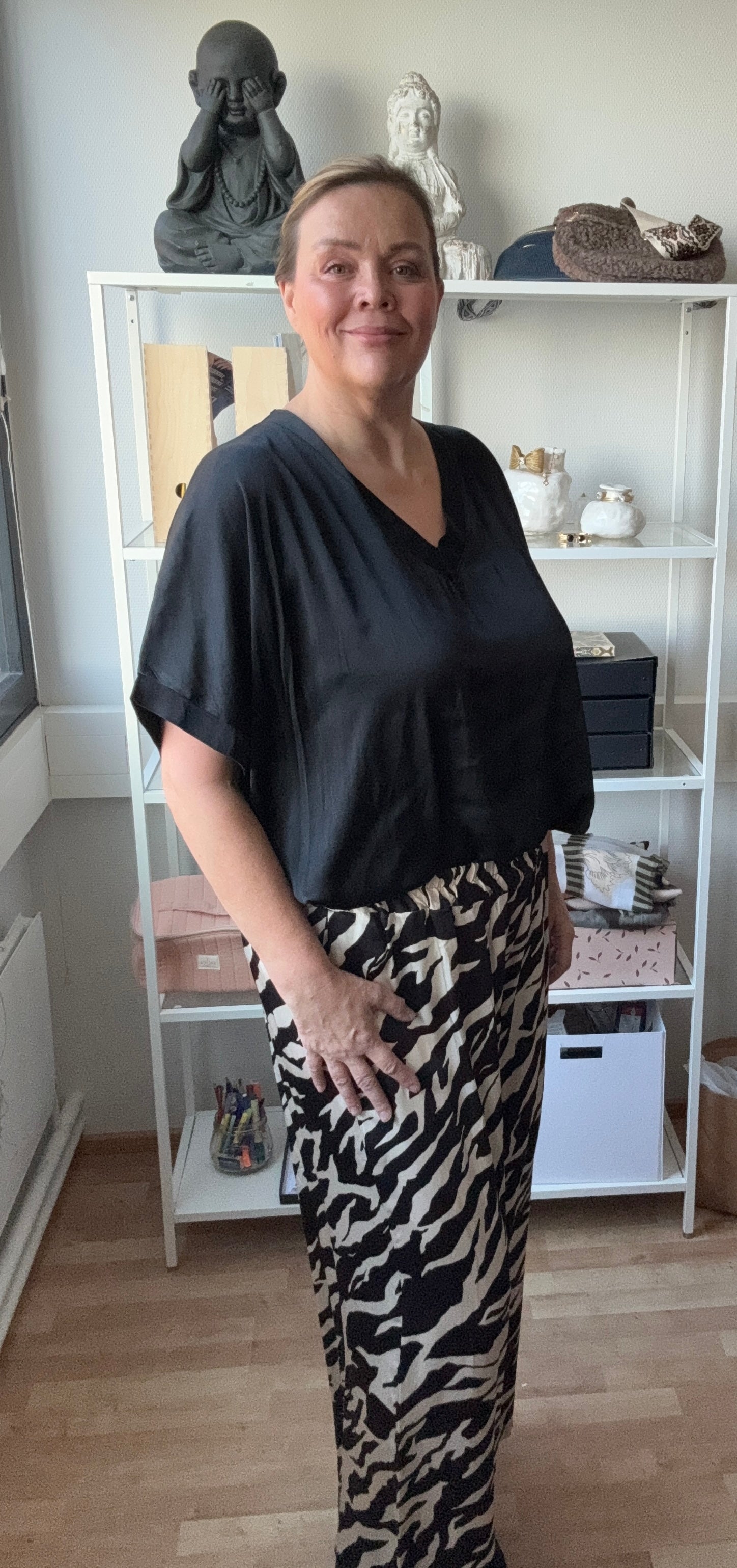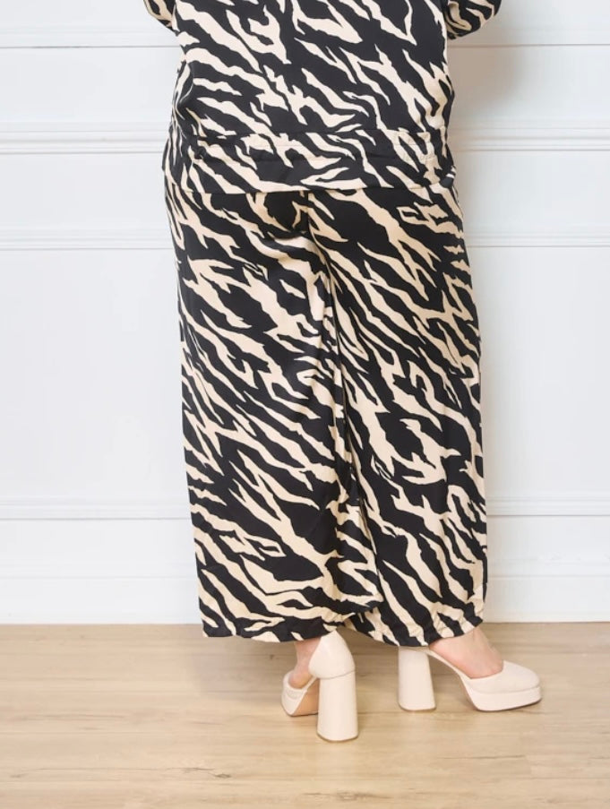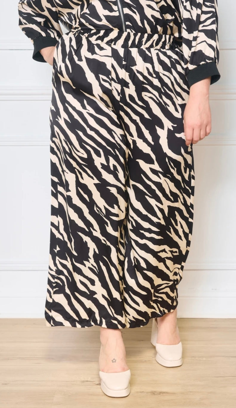 Väljät housut, joissa on joustava vyötärö ja mukava leikkaus rennon tyylin luomiseen. Housujen kuosi on saanut inspiraationsa luonnon eläinmaailmasta, ja leveät lahkeet korostavat keveyttä ja liikkumisen vapautta. Täydellinen yhdistelmä tyyliä ja päivittäistä mukavuutta.Taskut.
