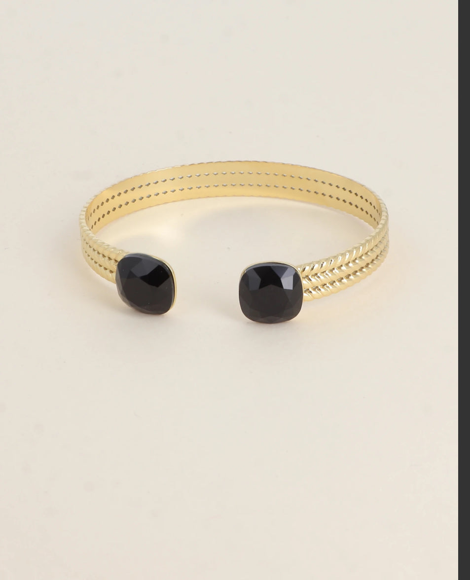 Tämä tyylikäs ruostumattomasta teräksestä valmistettu rannekoru on punottu ja koristeltu kahdella säihkyvällä Swarovski®-kristallilla. Rannekorua voi muokata: se kiristyy tai laajenee tarpeen mukaan. Jää auki edestä!