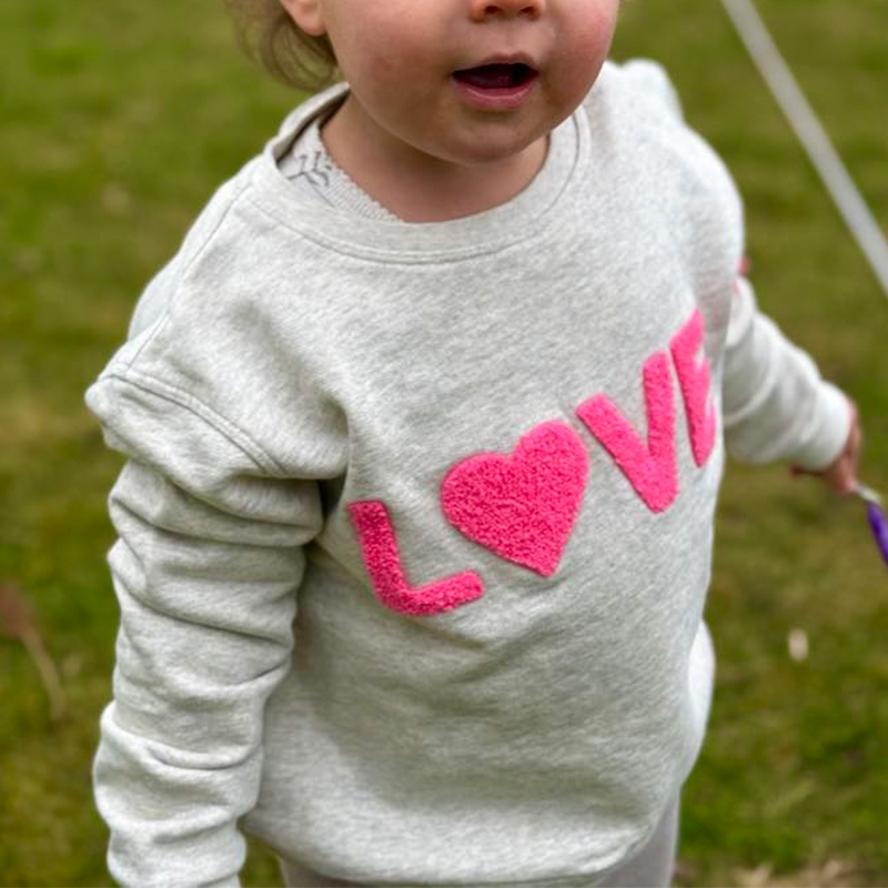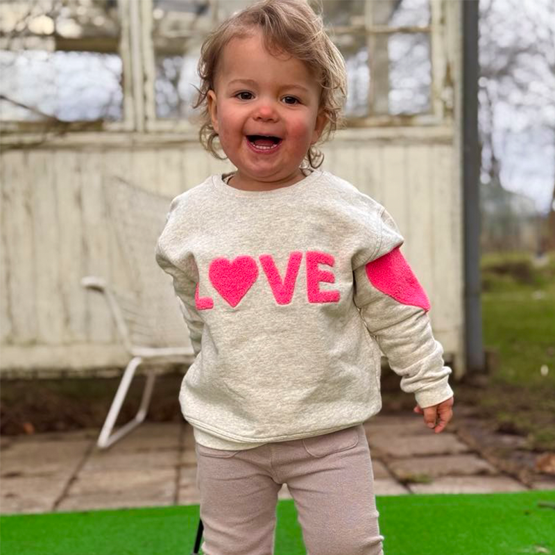 Kaunis Love-college lapsille, joka on valmistettu laadukkaasta 100 % puuvillasta. Ihanan pehmeä, erittäin mukava päällä ja miellyttävä käytössä ympäri vuoden -myös kesällä. Normaali mitoitus. Edessä kaunis brodeerattu Love-teksti ja sydänkuvio hihassa.