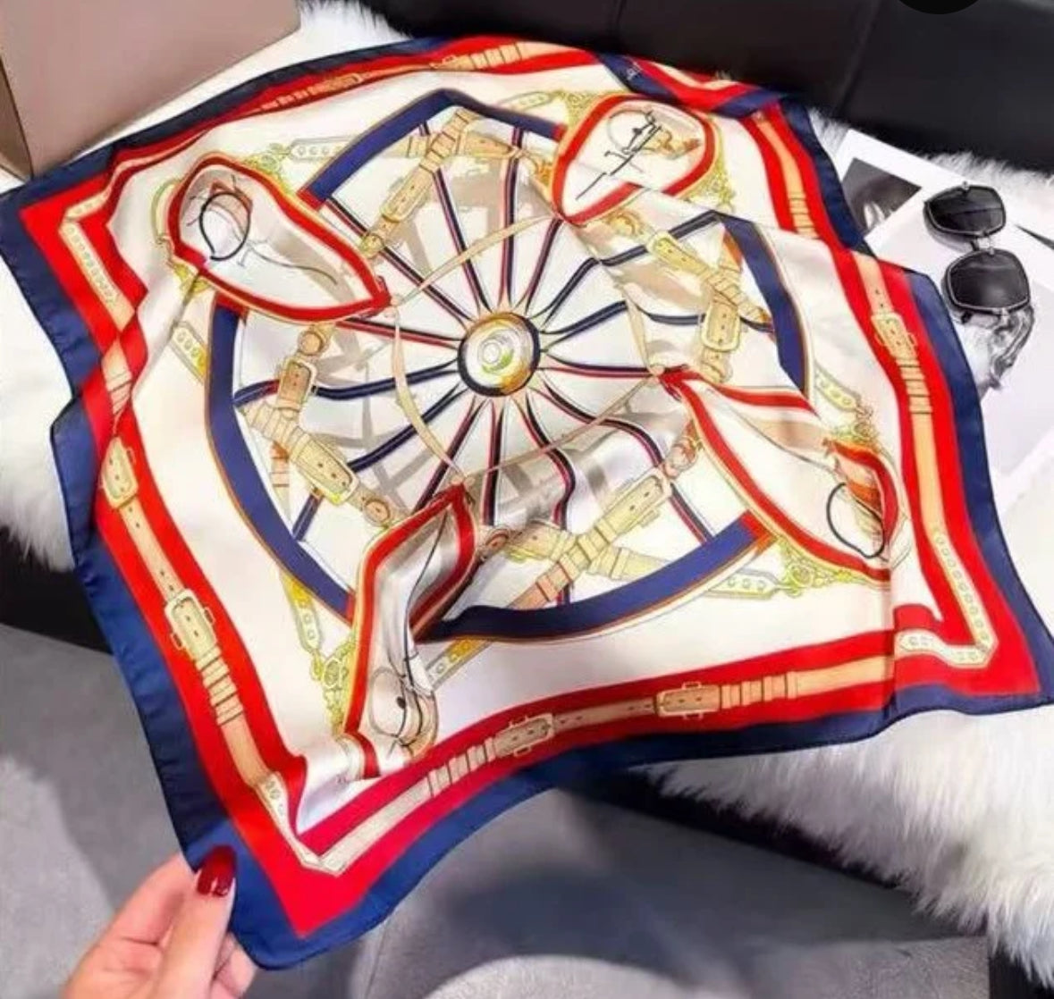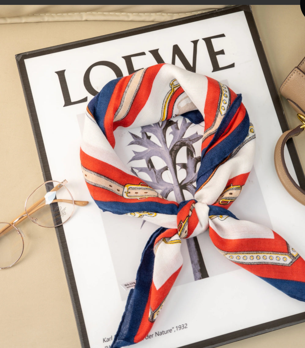 Tämä x cm kokoinen satiinimainen polyesterihuivi hurmaa tyylikkäällä meriaiheisella kuviollaan, jossa ketjut, köydet ja sävyt punainen, sininen ja kulta yhdistyvät upeasti. Pehmeä, kevyt ja silkkimäinen huivi sopii kaulalle, hiuspannaksi tai laukun koristeeksi. Chic ja monipuolinen asuste, joka tuo väriä ja tyyliä kaikkiin asuihin.