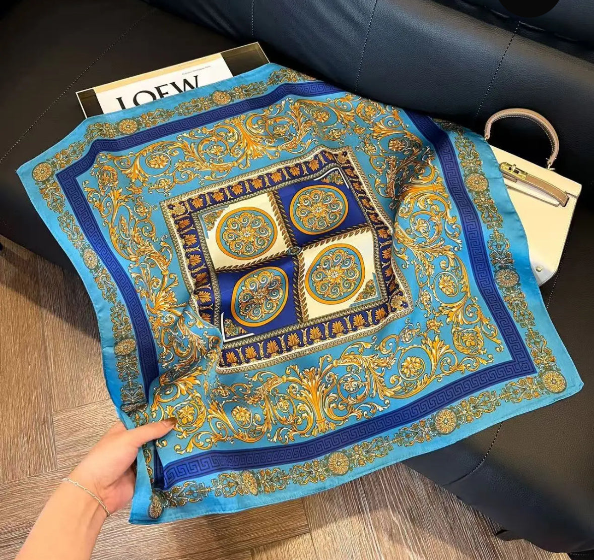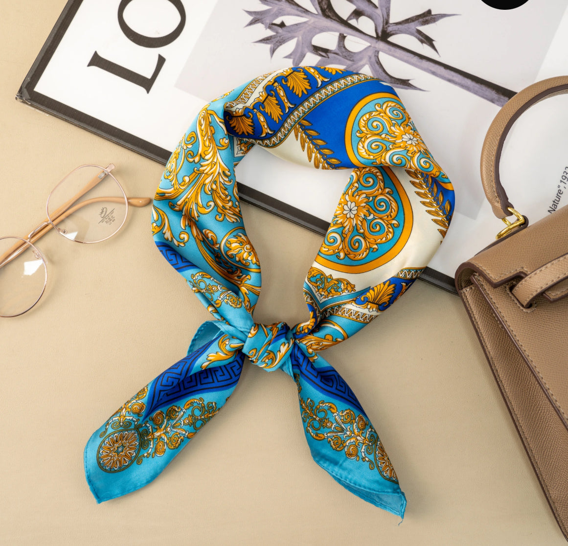 Tämä x cm kokoinen silkkimäinen polyesterihuivi huokuu eleganssia. Valkoiset pilkut ja graafiset raidat syvän sinisellä pohjalla tuovat mieleen rantalomien raikkaan tunnelman. Kevyt, pehmeä ja kirkas huivi viimeistelee tyylikkäästi asusi kaulalla, hiuksissa tai laukun koristeena. Ajaton asuste, joka tuo arkeen ripauksen ylellisyyttä.