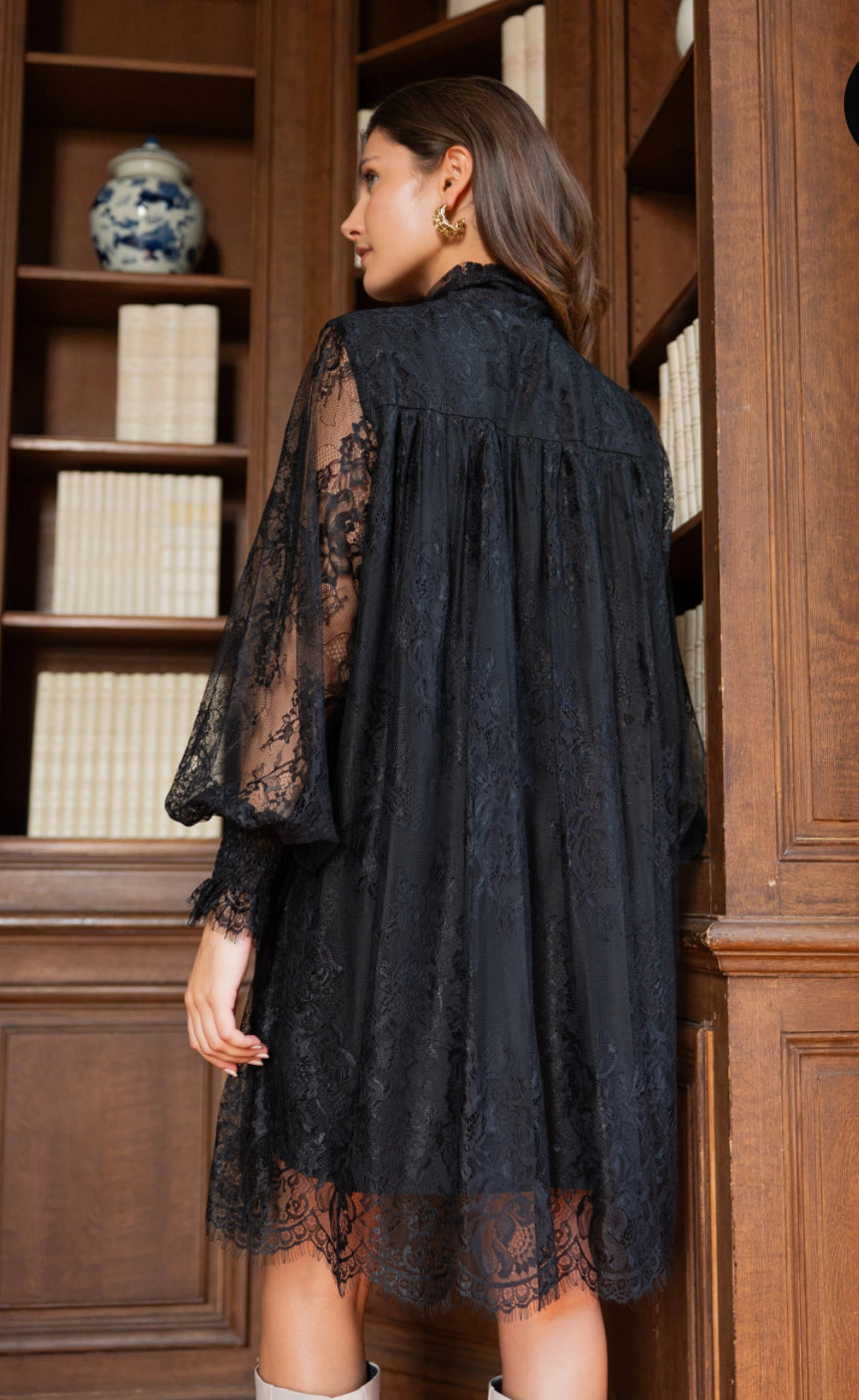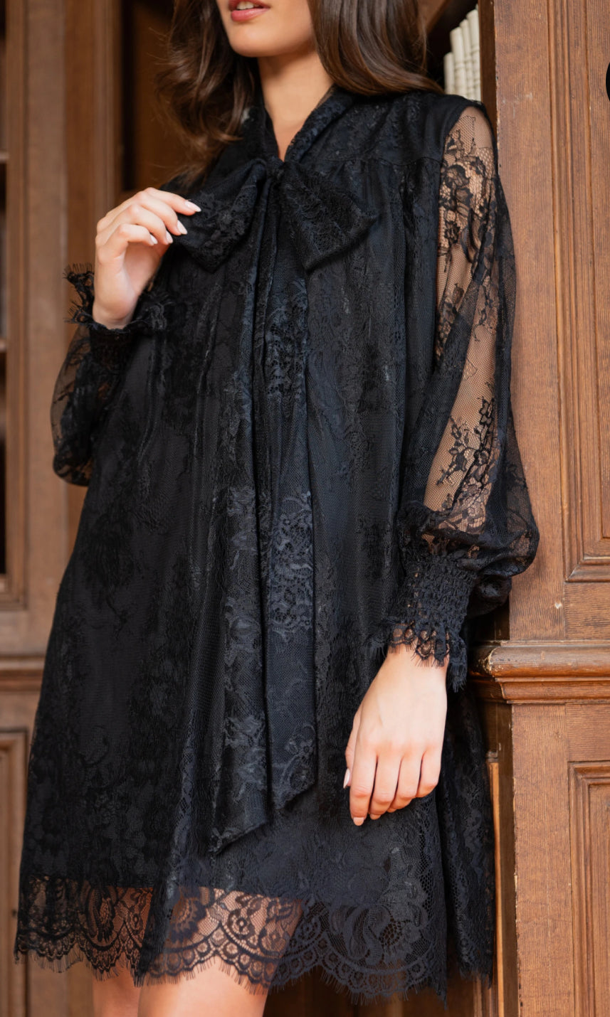 Sen ilmava leikkaus korostaa kaikkia siluetteja, ja kaulusta koristava integroitu huivi tarjoaa lukuisia tyylivaihtoehtoja: solmittuna boheemiin solmuun, huivin tavoin laskostettuna tai yksinkertaisesti auki siistin ilmeen saamiseksi. Pitkät, läpikuultavat pitsihihat lisäävät viimeistellyn ja elegantin kosketuksen.