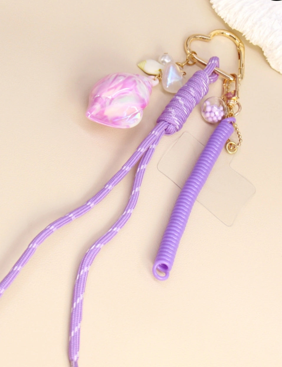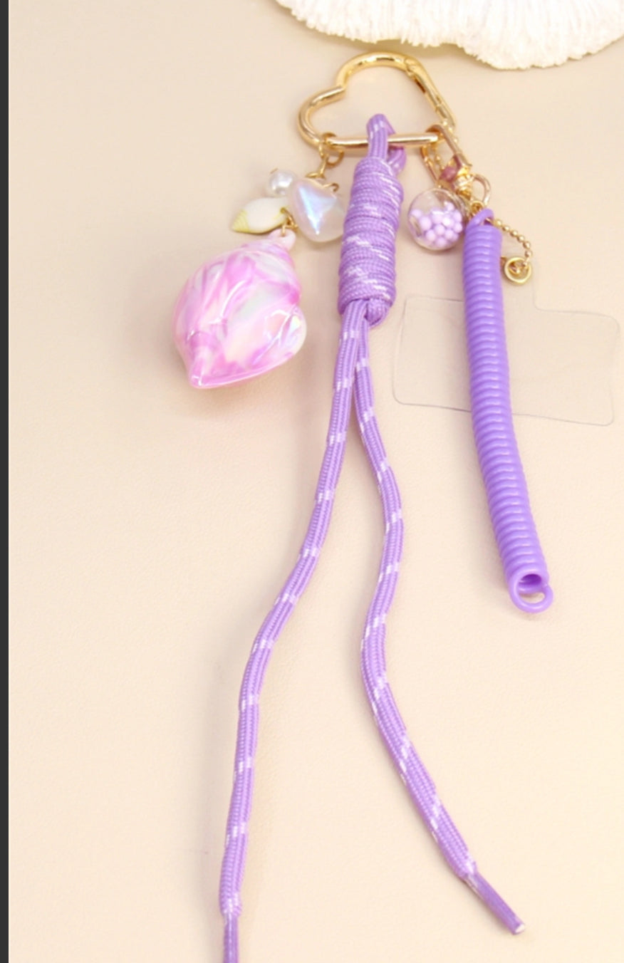 Kultaisessa sydämenmuotoisessa lukossa roikkuva viehätys sisältää laventelinväriset nauhat, pieniä koristehelmiä sekä muovisen sovittimen älypuhelimelle. Täydellinen lisä kesäisen ja omaperäisen ilmeen tuomiseksi laukkuun, pussukkaan tai puhelimeen!