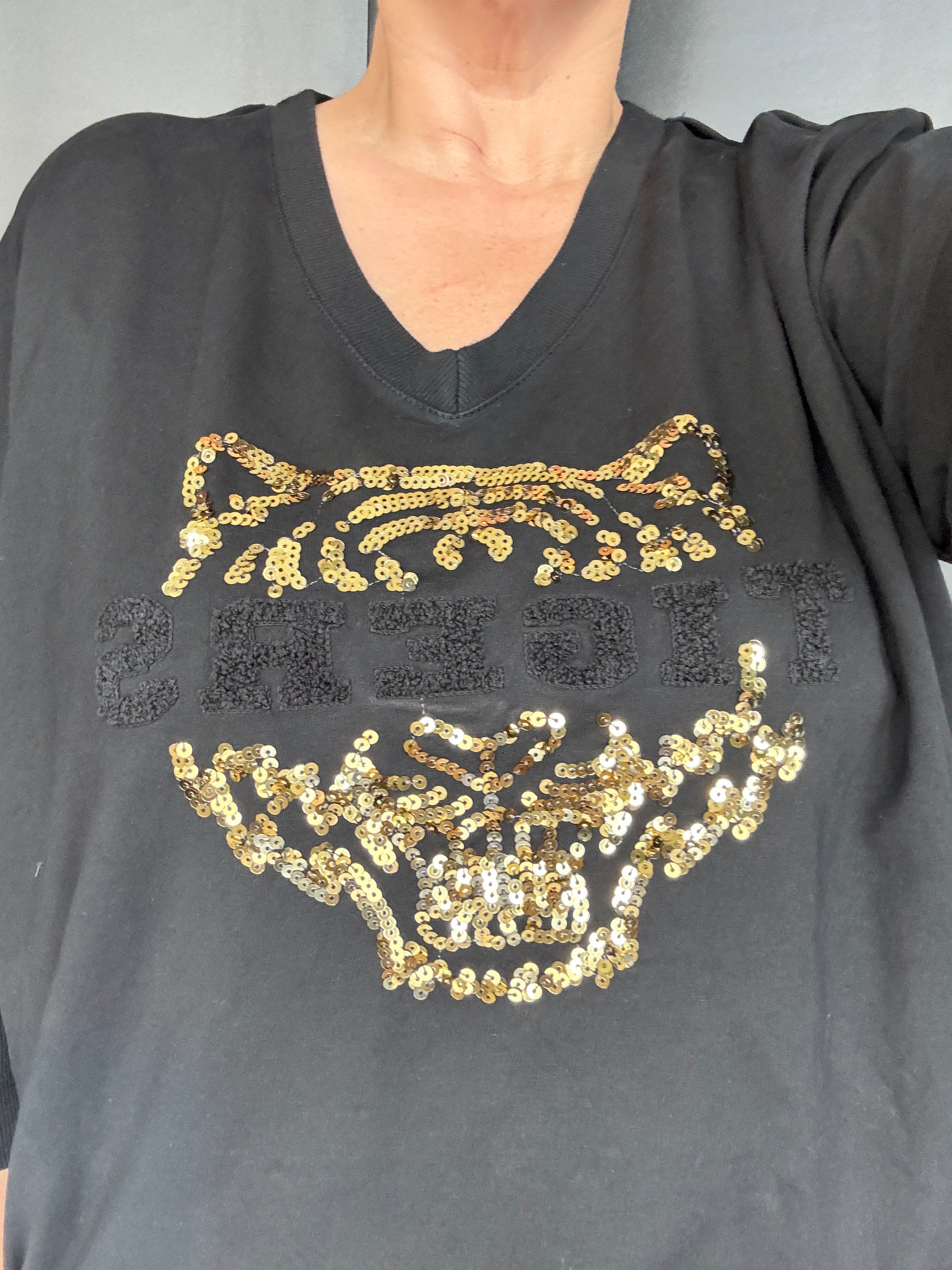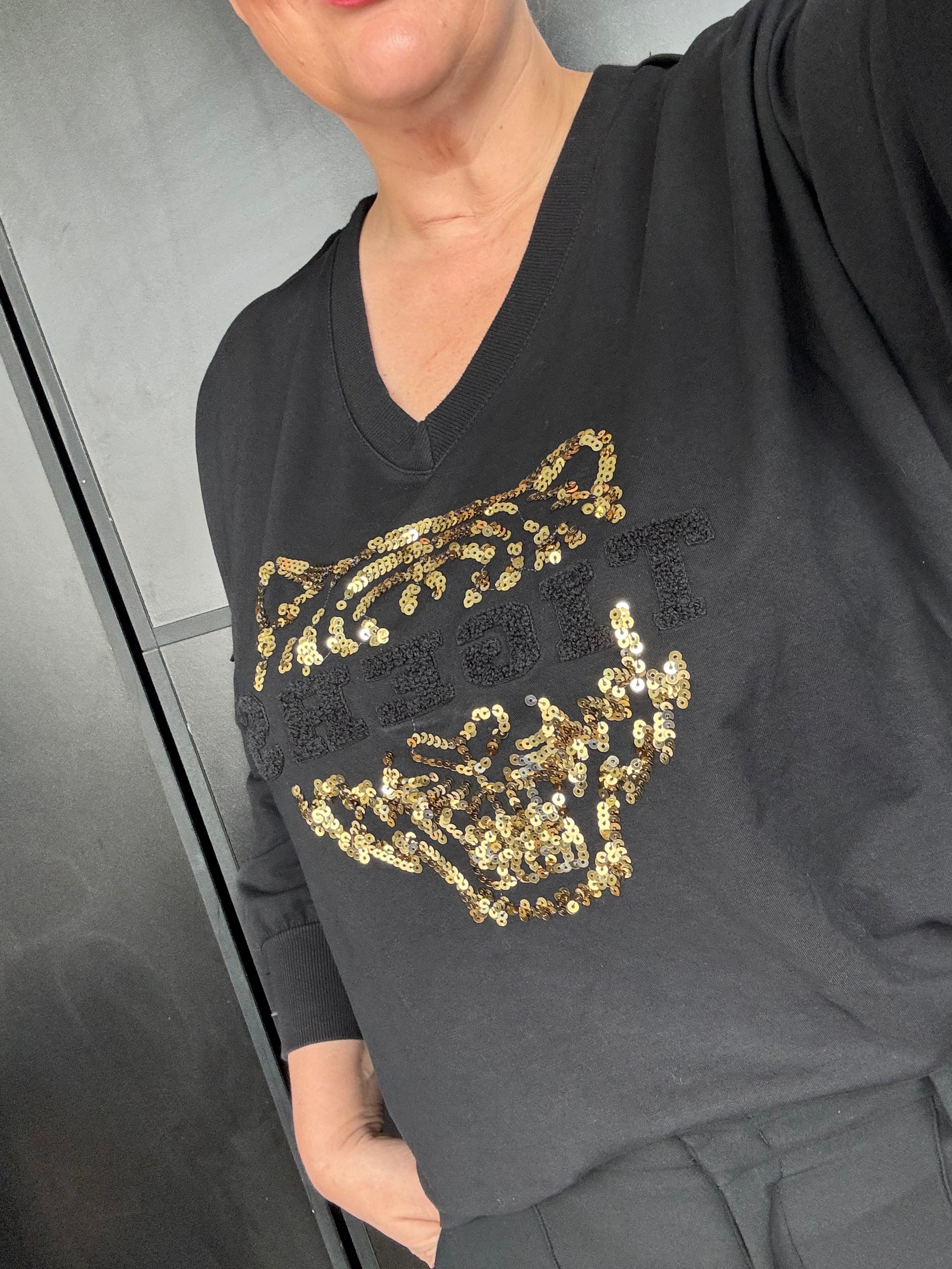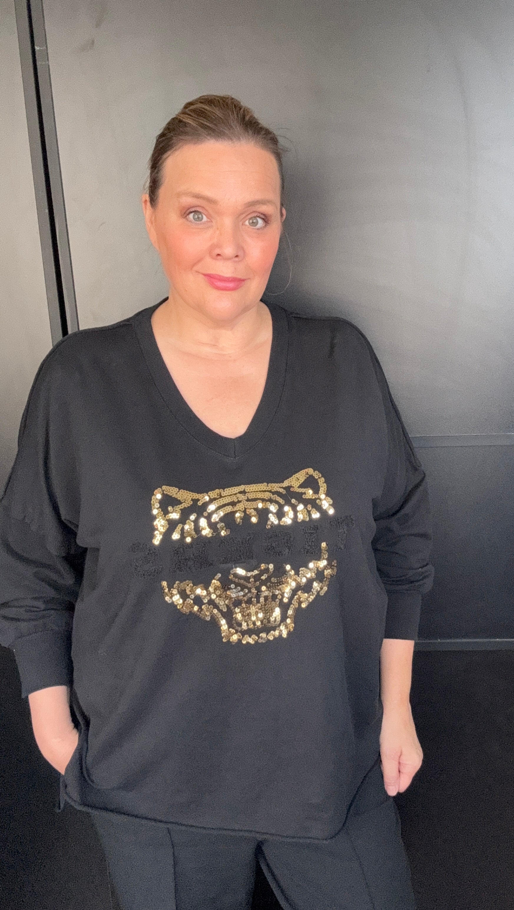 Tämä 100 % puuvillainen paita on suunniteltu erityisesti pluskokoisille, ja sen pehmeä materiaali tuntuu miellyttävältä päällä. Paidassa on näyttävä kultainen tiikeriprintti edessä ja tyylikäs V-aukko, joka tuo asuun naisellista ilmettä. Alareunassa ei ole resoria, joten paita laskeutuu luonnollisesti ja antaa rennon, huolitellun vaikutelman.